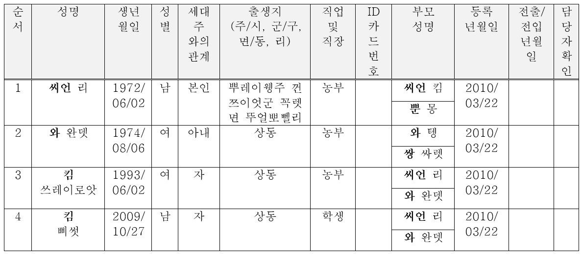 이상의 표는 캄보디아의 가상의 가족관계등록부를 한국어로 번역해서 제시해 보았다. 남편을 세대주로 해서 아내와 1남1녀를 부양가족으로 등재한 명부이다. 세대주의 성은 친부의 성과 같은 ‘씨언’이지만 자녀들의 성은 할아버지 씨언 킴 분의 이름자인 ‘킴’을 부여한 것을 알 수 있다. 이처럼 성을 따르는 규칙이 세대별로도 일치하지 않은 모습이다. 살펴본 바에 따르면 캄보디아 젊은이들의 성은 ①아버지의 성 또는 이름, ②친할아버지의 성 또는 이름, ③어머니의 성 또는 이름 등을 다양하게 따르고 있었다.